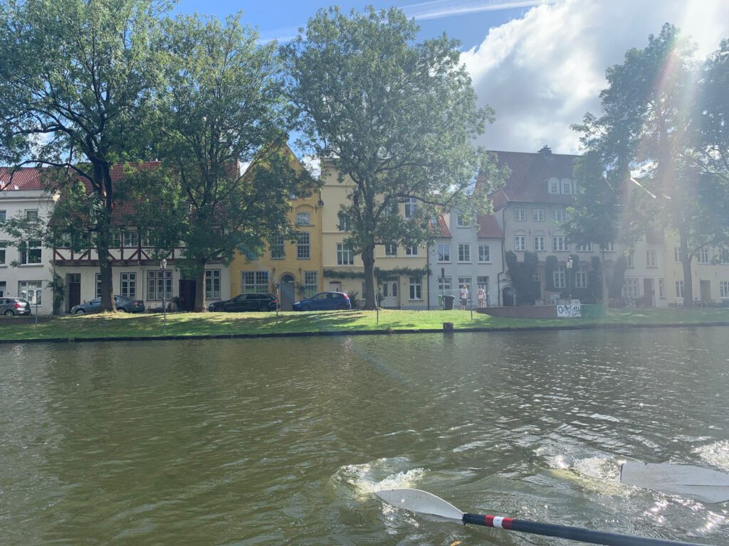 Und schon war Sonntag, der letzte Tag unserer Fahrt. Heute begleitete uns Norbert, der Wanderruderwart des Lübecker Ruderklubs. Mit zwei Vierern und zwei Zweiern umrundeten wir die Lübecker Altstadt – Sightseeing vom Wasser aus, ganz entspannt.