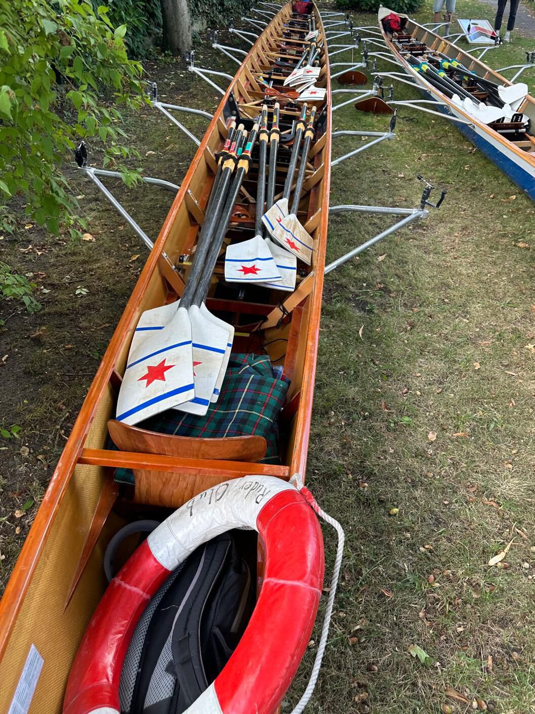 Am Ziel angekommen, trugen wir – begleitet von stimmungsvoller Jazzmusik – den Achter an Land und suchten einen geeigneten Platz auf dem Vereinsgelände.